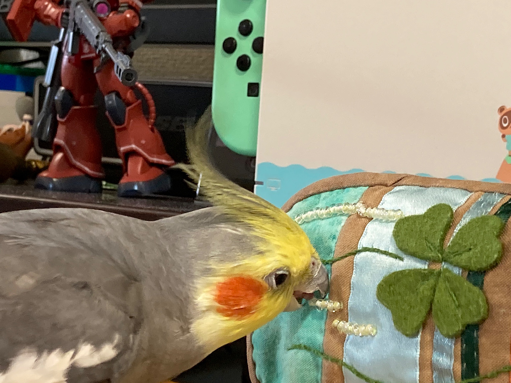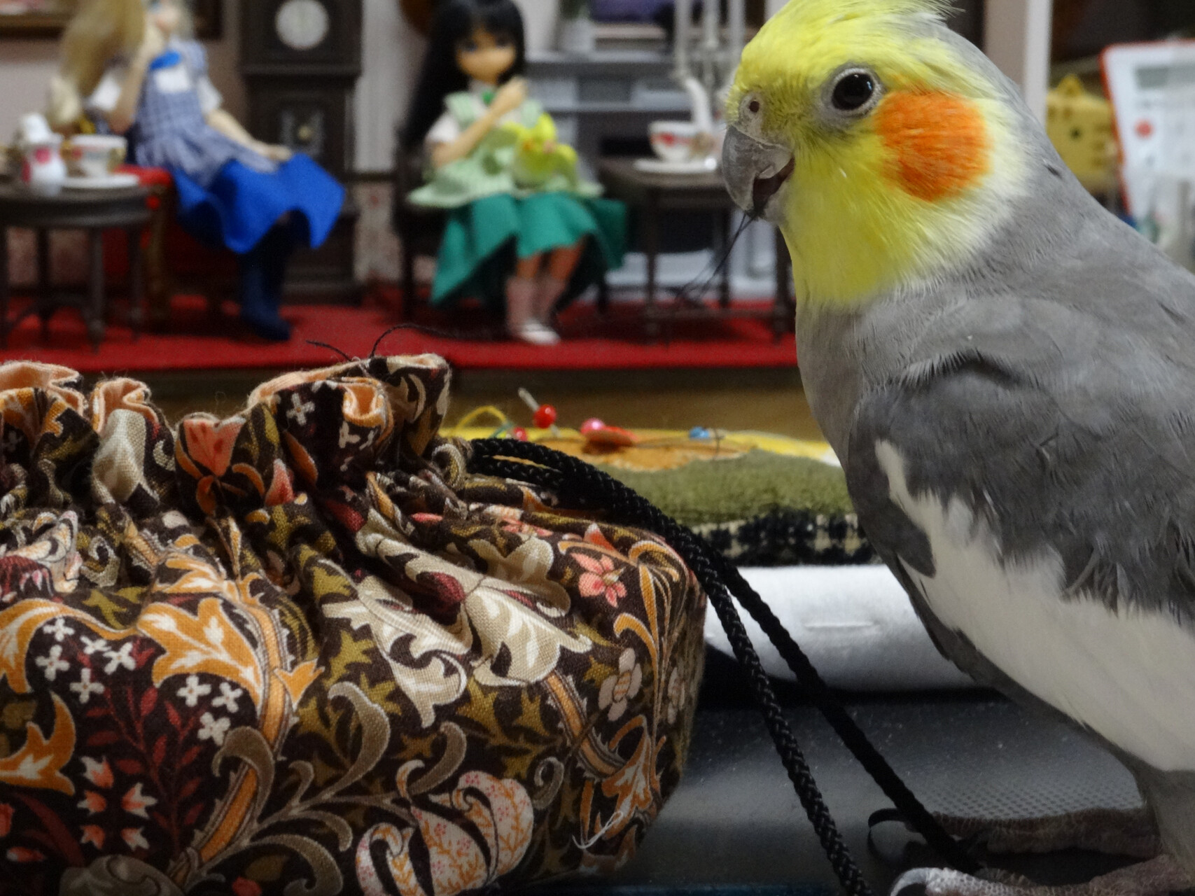 裁縫道具が入った巾着の紐が気になっていたらしい。